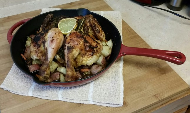 5. Remove chicken and set aside on a plate. Cut up potatoes, carrots, and celery. Cook for 1 minute in cast iron pan. Place chicken on top, breast side up and squeeze half a lemon over chicken. Place lemon slices and rosemary on top.