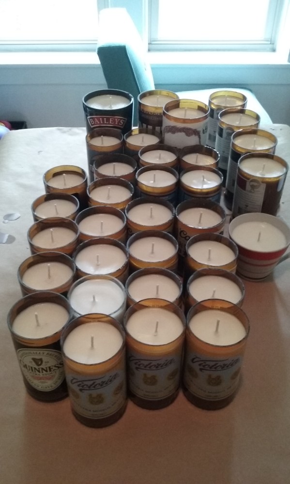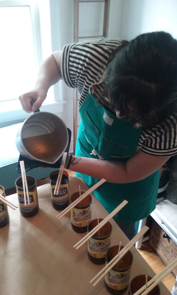 So this year I promised myself that I would do something creative and crafty. I had the idea to make beer bottle candles after we had leftover wax from my teacup candle party favors for our wedding in October. For Christmas Kevin even gave me a bottle cutter! Now, I am truly not the craftiest person out there, but since I had to DIY for the wedding, I’ve come to enjoy the challenge of making something out of something else or just making something else all together. In February I decided to sign up for an Arts and Crafts Street Fair here in Evanston. I paid for the booth spot up front, because I knew if I wasn’t tied to it financially I would never do it. I also invited some friends along to share the booth space with me. Chris of Myth and Arrow (his Facebook) and Stephanie of Franny Pax (her Facebook).